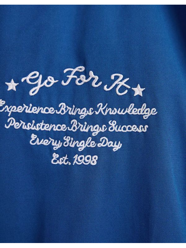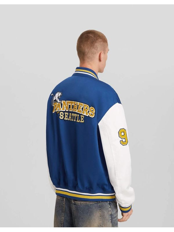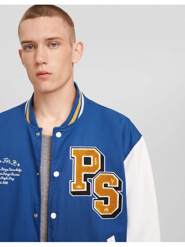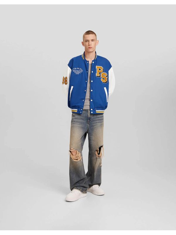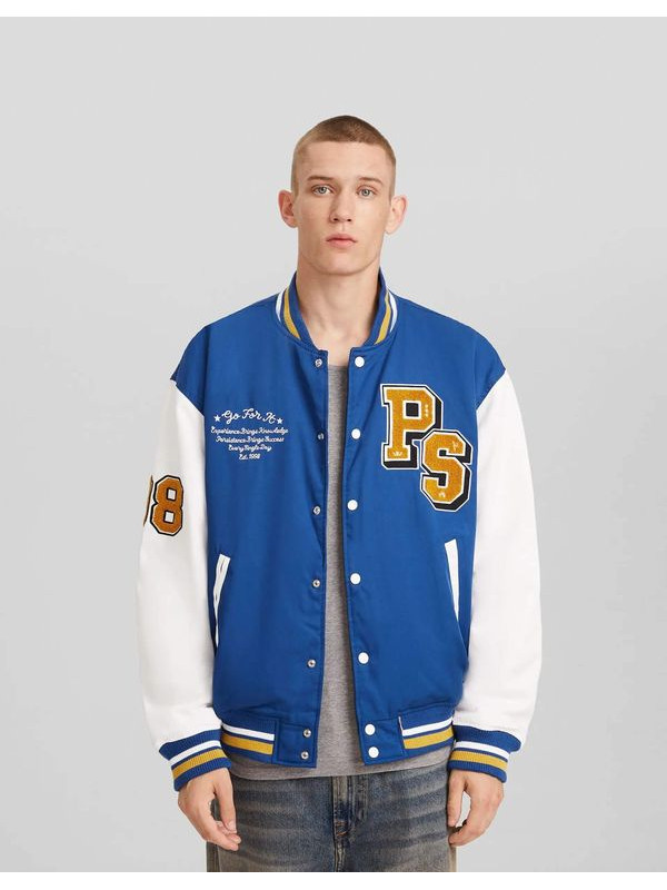Бомбер Bershka Puffer Bomber With Patches, синий/белый